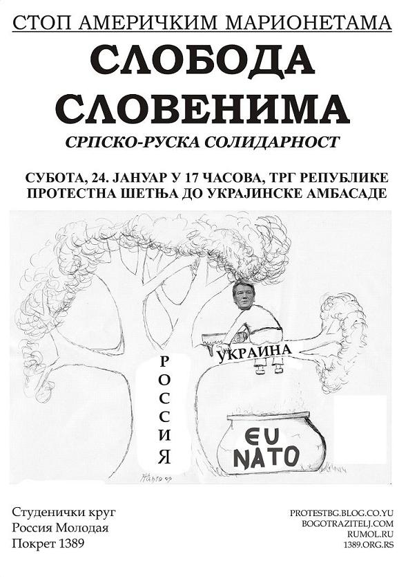 Раде Љубичић, представник Покрета 1389, је представио грађанима плакате које су урадили организатори протеста као најаву суботњег протеста и шетње до амабасаде Републике Украјине. Протест ће бити одржан под називом:" Слобода Словенима, стоп америчким марионетама!". Циљ је да се укаже на погубно деловање украјинског режима који је под утицајем ЕУ и САД и да се укаже на значај сарадње међу словенским земљама. Уместо да сарађују и буду снажан културни,економски и политички блок, словеснке земље дозвољавају да их посвађају САД и ЕУ који то наравно чине из сопствених интереса јер им не одговара јака противтежа. Акција лепљења плаката ће бити настављена и сутра, уз апел да тог дана буде што више људи на Тргу Републике.