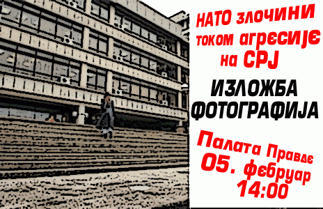 Српски народни покрет 1389 и Народни покрет Србије организују у четвртак 5. фебруара у 14 сати испред Палате правде у улици Савска 17а изложбу фототографија „НАТО злочини током агресије на СРЈ“. Током изложбе председнику Окружног суда у Београду биће предато писмо са захтевом да обавести јавност шта је са судским поступком против 14 челника НАТО земаља који су учествовали у бомбардовању СРЈ 1999. године.Ни десет година после НАТО агресије није донета правоснажна пресуда против ратних злочиница одговорних за смрт око 2500 грађана. После укидања првобитне пресуде од стране Врховног суда, обустављањем поступка од стране Окружног суда и након укидања Војних судова нејасно је да ли се и пред којим судом у Србији води поступак против НАТО злочинаца. У Складу са Законом о преузимању надлежности Војних судова предмет је 2004 године требао да се врати на Окружни суду Београду.